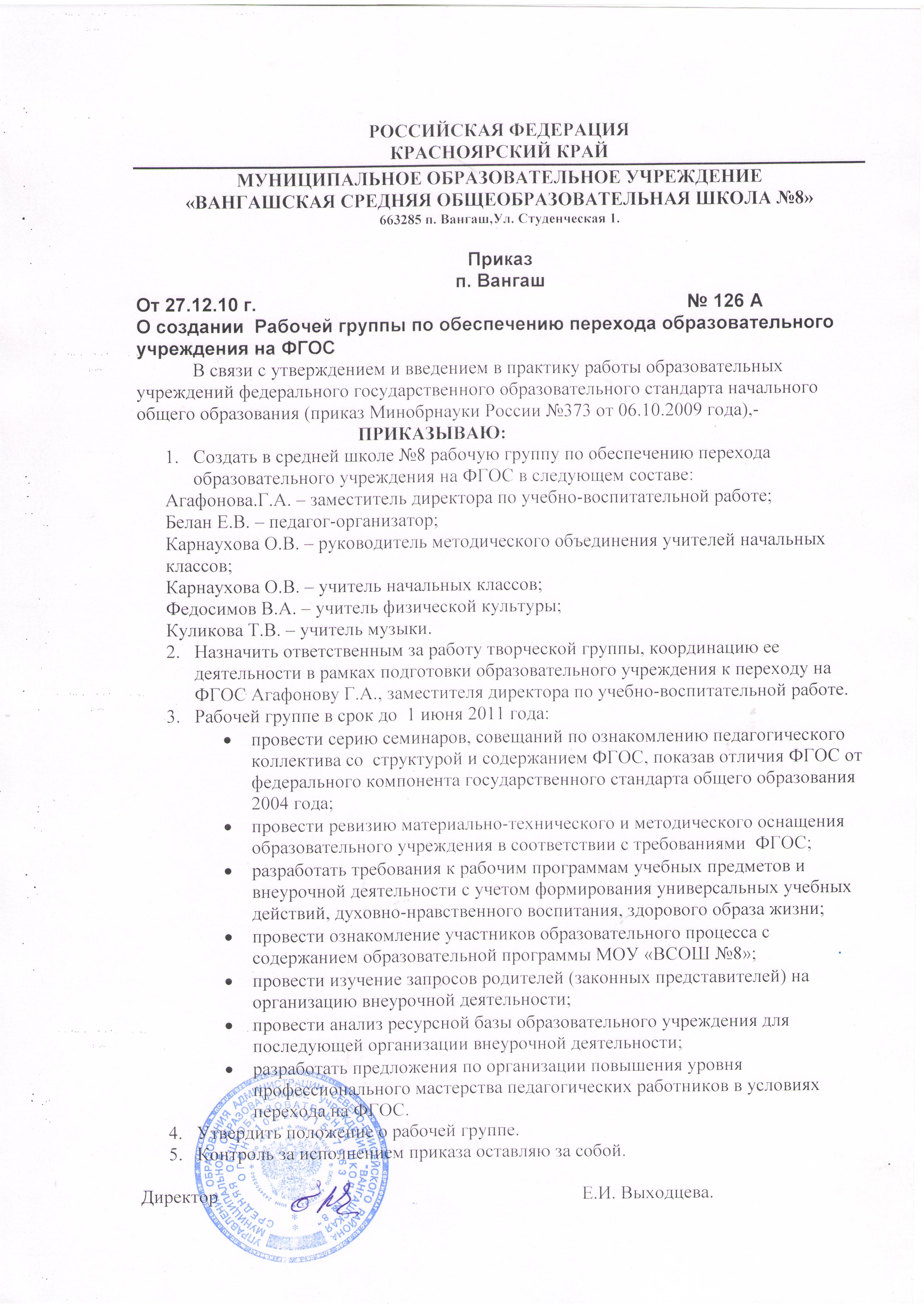 Приказ о создании группы по обеспечению перехода образовательного учредения на ФГОС